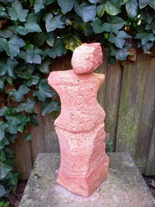 2022Vrouwenbeeld uit zacht kalksteen met ronde vormen vol verwachting op wat komen gaat.